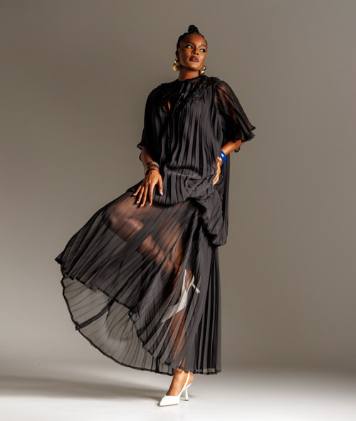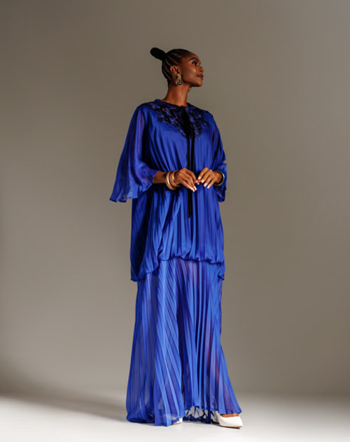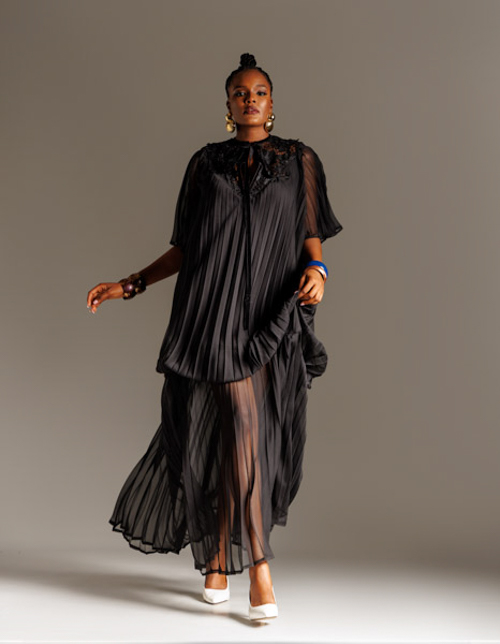 A contemporary take on the classic boubou featuring our signature miniature pleats in silk chiffon, lace, and velvet ribbon neckline, which alternates both front and backwards. The semi-sheer bottom gives off a subtle sexiness while the chic midi-length makes it perfect for semi-formal occasions, date nights, dressy evenings, or brunching with friends and family on a casual weekend
