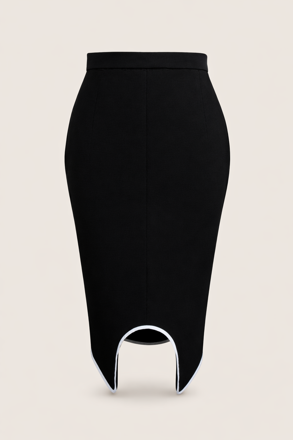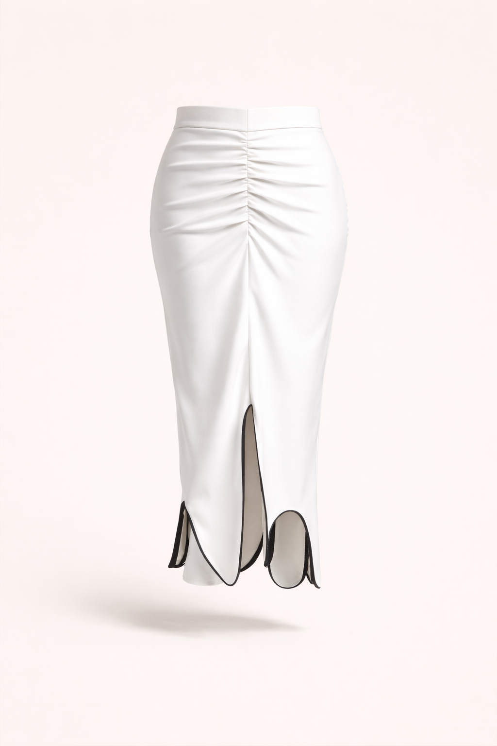 Exaggerated scallop pipped hem of the skirt adds a quirky detail to the look,with a ruched back bum detail to give an illusion of a bigger bum.