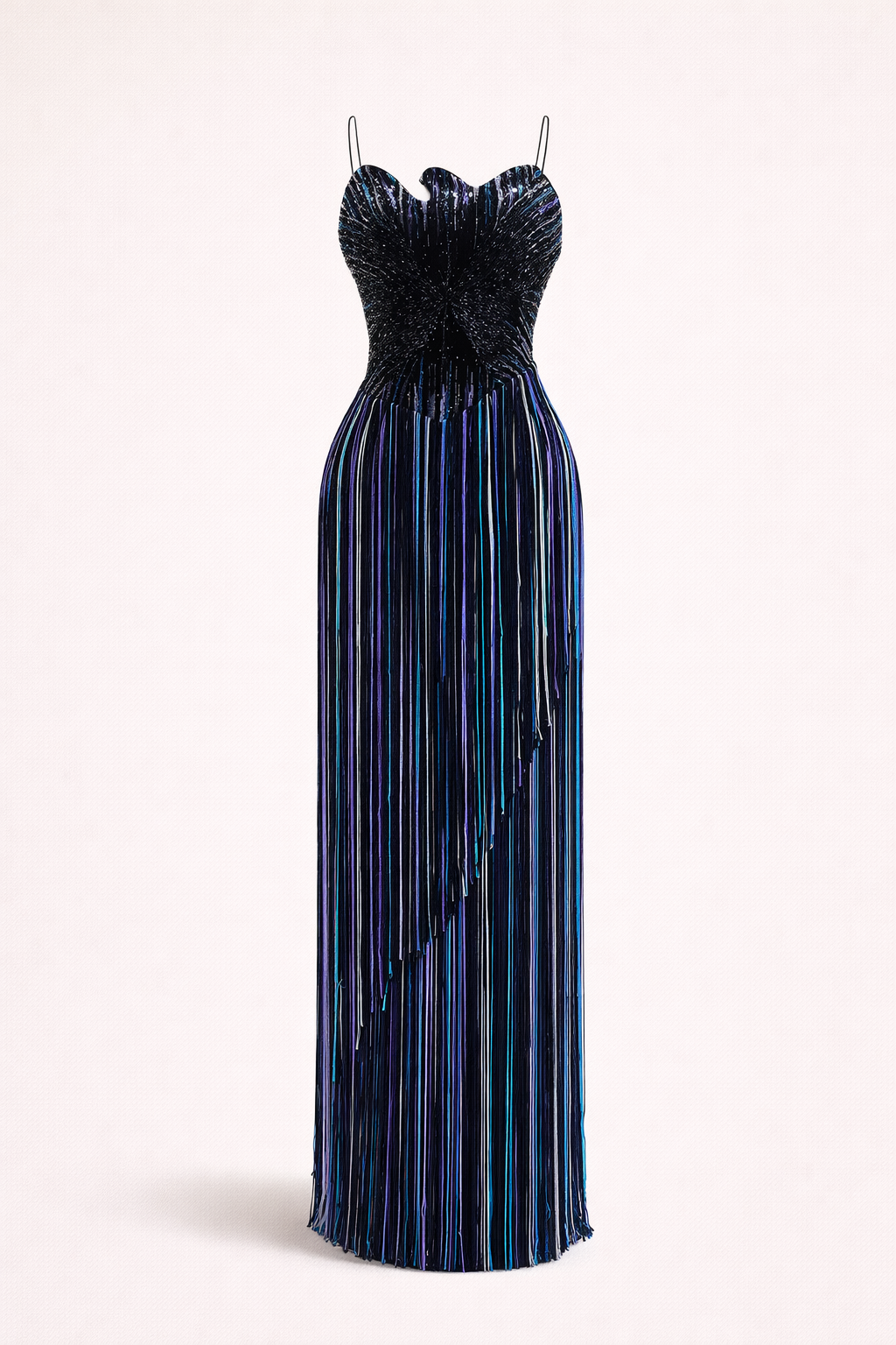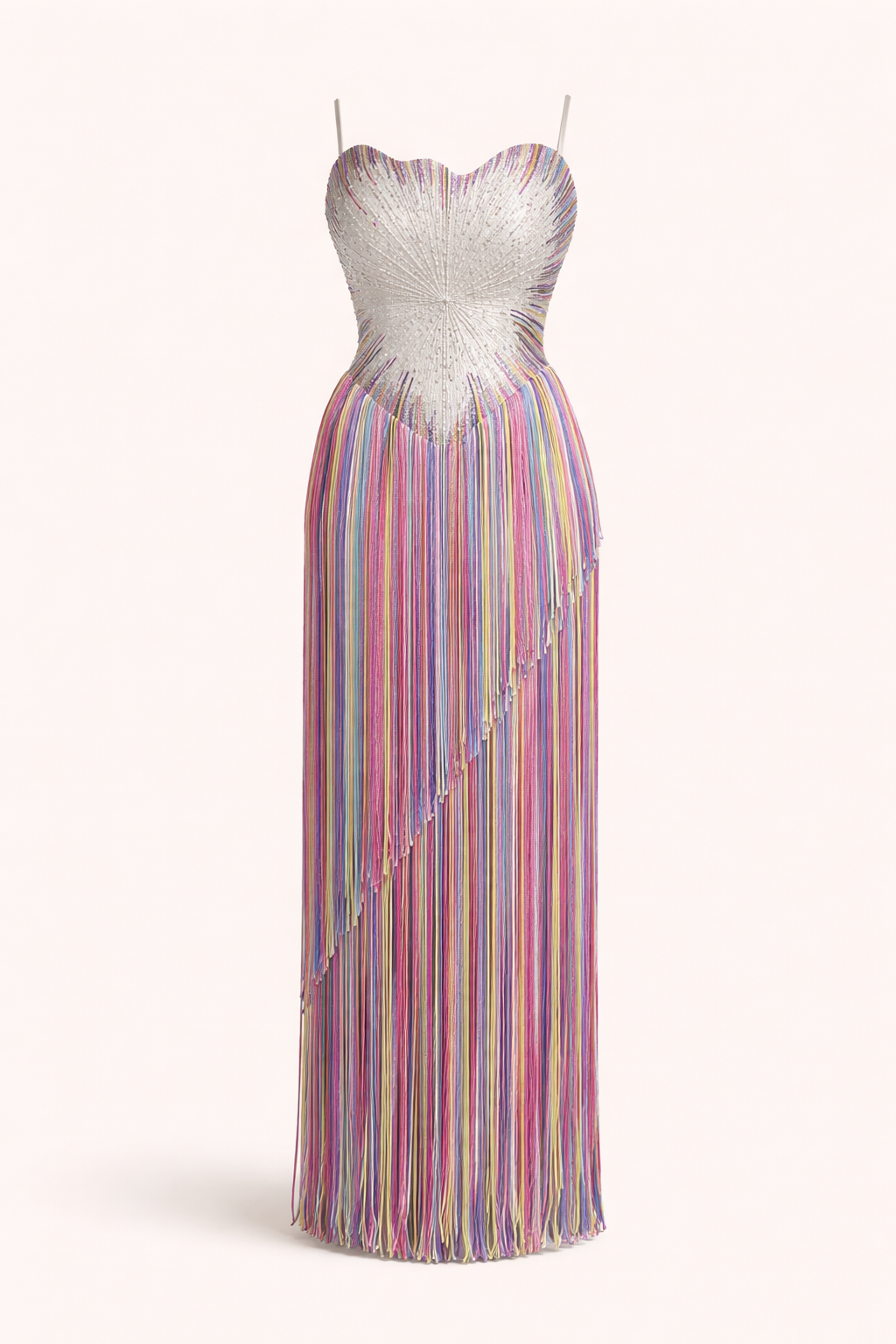 Dress features an illusion of an explosive burst of colors done with intricate beadwork around the bodice, a scalloped neckline and individual hand tacked tassels.