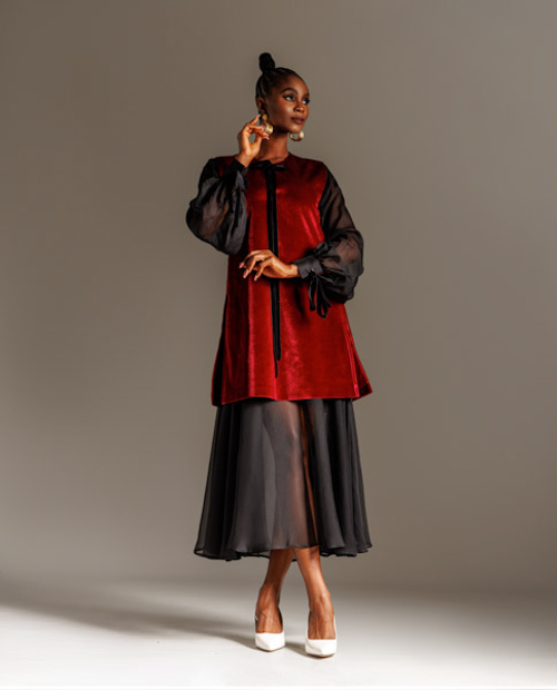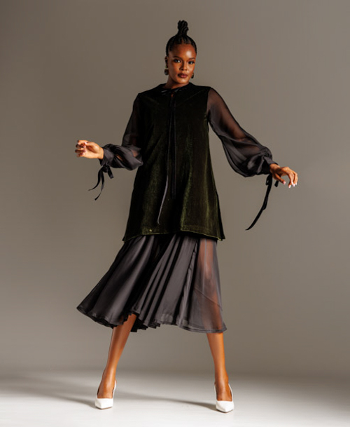 Two-tone Velvet and chiffon dress with semi-sheer lower bottom detail for a fun effect while still being classic. Perfect for dressy day time looks that say you?re classy and timeless in your approach to dressing