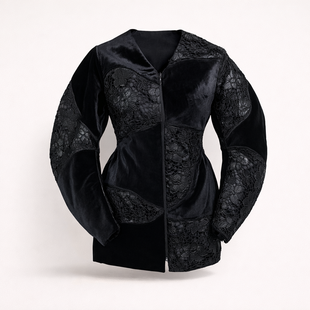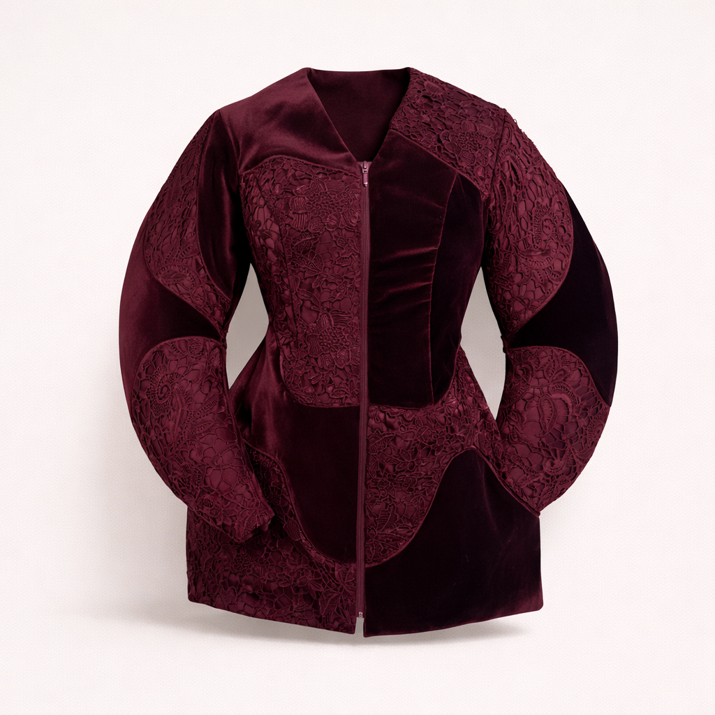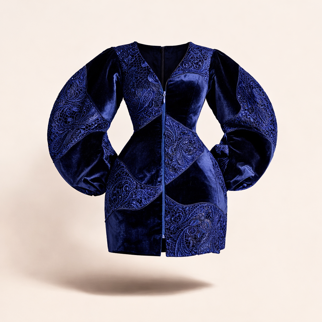 Crafted from a medley of velvet and lace, featuring a statement architectural sleeve design, cinched in waist, curved mini bottom and front split zipper detail, Nkili is straight to the point and easy to wear, making it a go-to outfit for moments when you want to be unforgettable.