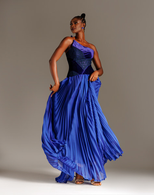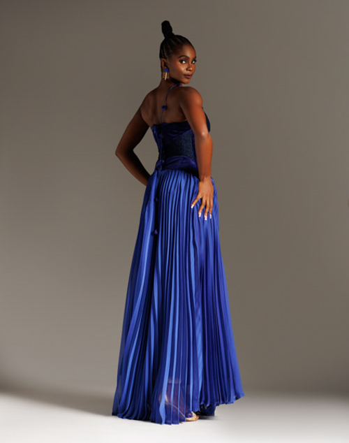 An asymmetric multi-texture evening dress featuring an intricate hand-tacked placed pattern of velvet and lace on a corseted top half, finished with a zipper or ease. The ball detail straps add a layer of sophistication while the house pleats in silk chiffon flow delicately for a maxi effect. The Oma dress is a statement piece that doubles as a conversation starter.
